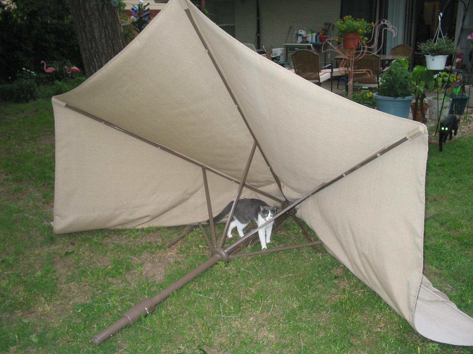 Came home from rehearsal last night to find my patio in chaos. The wind, the 30 plus mile an hour winds had blown over my umbrella and glass table. Yes, we should have put the umbrella down,but it wasn’t windy when I left and I didn’t even think ahead. I came home to see it all toppled over, the umbrella in pieces. I loved this thing. It was a special gift from my Mom and Bonus Dad, that they spent way too much on and that Bonus Dad really picked out for me. Nice. and now, in pieces being used as a kitty tent.